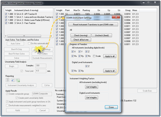 Much like the best fit dialog, the initial values reported are the current instrument alignment conditions. By going to the Instrument Settings you can adjust the degrees of freedom of any instrument in the network, as well as the weighting individual instruments have on the overall fit (see Figure 7). Before you begin the fitting process, you may also want to use the Exclude Measurements button, which provides a filtered list of points that can be excluded from the network solution.