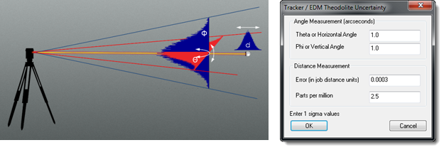 In order to mathematically calculate the cloud distributions, SA utilizes a Gaussian random number generator (utilizing a Box-Muller algorithm) because real-world, natural processes tend to have a Gaussian distribution. It builds uncertainty clouds in three dimensions based upon the uncertainty values of the instrument and the number of samples you specify for each point using a preset confidence interval (see Figure 5). The uncertainty values can be set independently for Theta, Phi, and distance for each instrument, although the default values are usually an excellent starting point.
