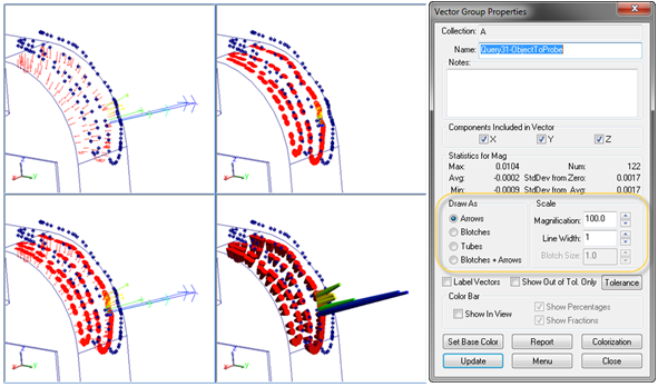 Deviations between measurements of a part and the design part in metrology are typically quite small, on the order of hundredths or thousandths of an inch. For the purposes of visualizing these deviations, vectors are drawn at 100:1 scale. Therefore, if you have a one hundredth of an inch deviation in the part, the vector arrow will be drawn one inch long. This makes it easy to see relative deviations that would otherwise be nearly invisible; however, this value can be easily adjusted in order to more effectively display relative distances. The width of the arrow can also be adjusted.